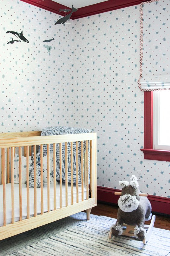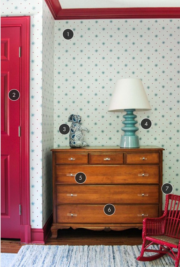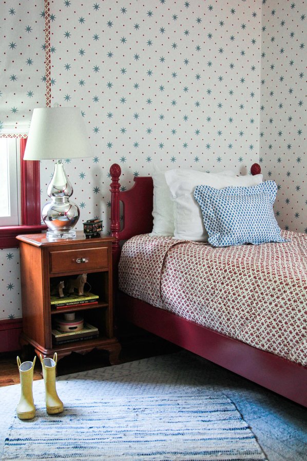When it comes to paint colors, don’t be too literal– I always suggest pulling out the unexpected color. In this case, it was the red dot in the Serendipity wallpaper. We selected this rich Farrow & Ball Rectory Red that complemented the wallpaper beautifully. This bold red also makes it so the room is comfortable for not only the sweet toddler boy Walker that lives there now, but the older boy he will become soon.